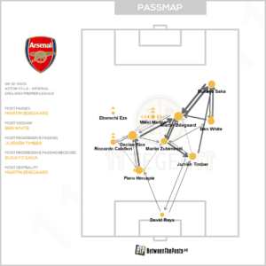 The right-sidedness of Arsenal’s attack was a trend in the game, especially going into the second half. Leandro Trossard and Viktor Gyökeres replaced Eze and Merino at half time, and Arsenal’s attack was focused on the right-sided circulation between White, Ødegaard (who moved higher when Arsenal established possession in Villa’s half), and Saka, before looking for far post crosses with the aforementioned Gyökeres and Trossard in the box, plus Calafiori arriving from deeper positions.