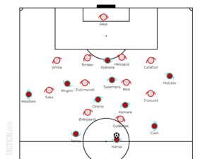Villa initially tried to exploit Maatsen’s freedom on the left, with mixed success. Arsenal’s pressing plan intentionally left him free, and was designed to squeeze the ball in this area, so Arteta’s side were generally prepared for this.
