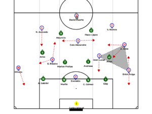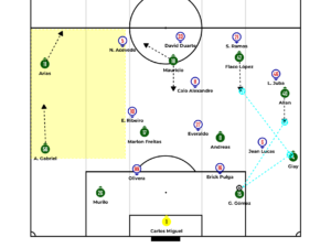 Just like in the first phase of build up, Andreas Pereira and Marlon Freitas are responsible for stretching the game, while the rest of the team manipulates the opposition’s marking so that Arias and Allan can receive in advantageous situations out wide and progress through individual quality. When not isolated, dribbling or finishing, they look for overlaps, inside or outside, from the fullbacks, but often receive inside support from one of the forwards for quick combinations.