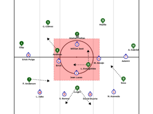 On the other hand, Everton Ribeiro, in this playmaking role, often dropped deeper to attract marking and free space for Jean Lucas to project from left to right, using Olivera, positioned wide, as support. Right side triangles rarely happened in the match. They usually occurred when center back Acevedo stepped forward to create an overload out wide. Acevedo, in fact, played with great freedom to carry the ball, offer support or even attack space to finish from the front when the team concentrated on the left side of the attacking half.