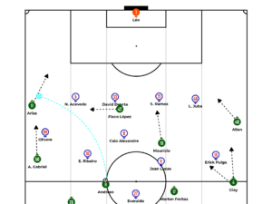 The intention of Palmeiras build up is to leave the Colombian Arias on the opposite side in advantage to progress with speed, often with the overlap of the left fullback. For that, the team organizes itself in a positional 4-2-4 formation. Giay and Gustavo Gómez start the build up looking for Flaco López inside and Allan out wide, making support runs, meaning dropping with their back to goal to connect with Andreas Pereira and Marlon Freitas facing forward. The pivots are mainly responsible for long diagonal passes to the opposite side, or even full switches of play.