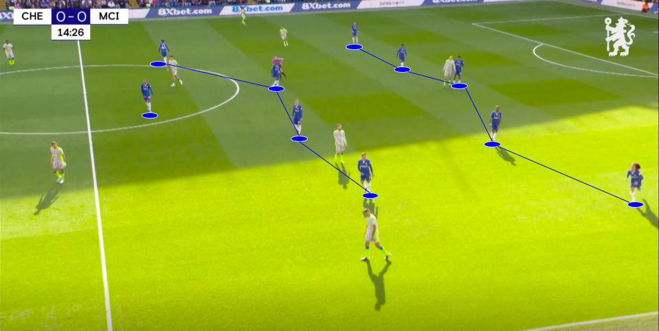 This created overloads in central zones and allowed full-backs to act as bounce options behind City’s front line. Joao Pedro frequently dropped deep as a false-nine, pulling a City centre-back out of position to open 1v1 channels for Neto and Estevao on the flanks. Palmer operated as a roaming No 10, making central runs or drifting to support left-side overloads, while Estevao and Neto targeted transitions with direct runs that pushed City’s back line deeper.