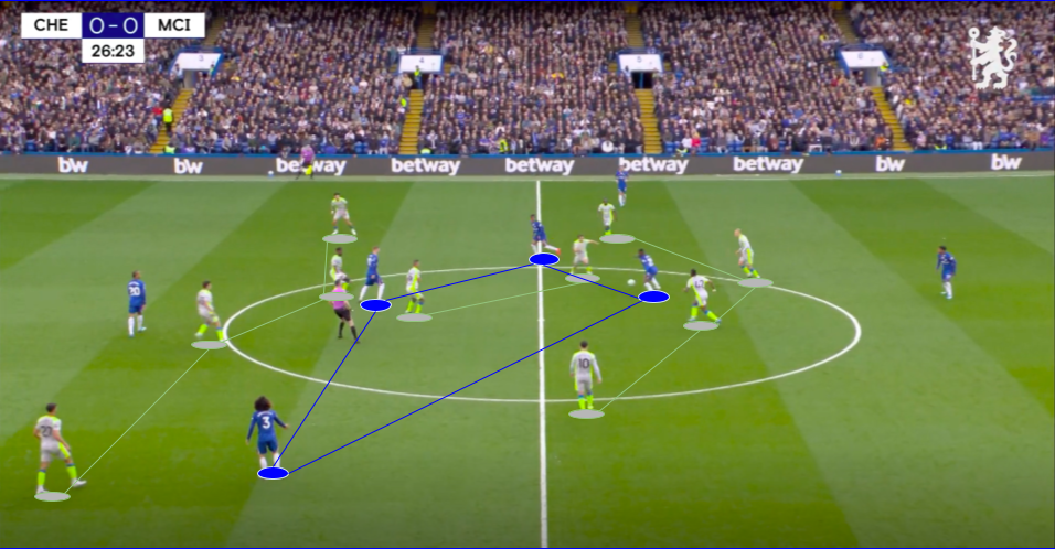 City’s 4-2-4 OOP press squeezes Chelsea’s 3-4-3 diamond. City’s 4-2-4 squeezes centrally, blocking central lanes as Chelsea’s 3-4-3 diamond attempt to build. City’s narrow shape and press results in a turnover as Bernardo Silva presses Caicedo into losing the ball.