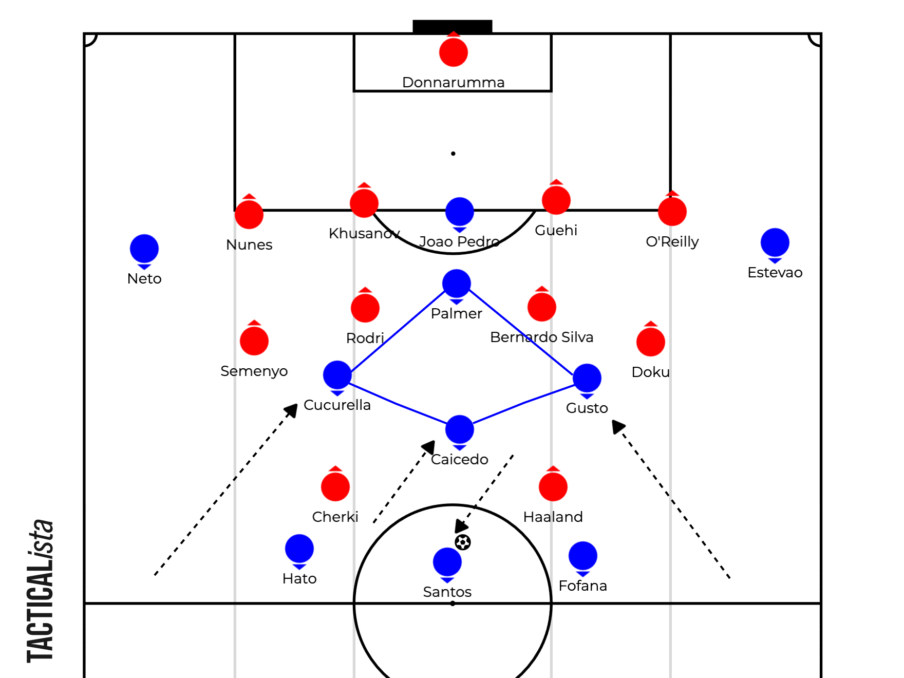 Chelsea’s 3-4-3 diamond in their IP shape vs City’s 4-4-2 block. Santos drops into the back three, while Caicedo pushes into the pivot of the diamond. Both full backs Gusto and Cucurella invert into midfield while Cole Palmer is at the tip of the diamond as the CAM.