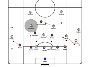 In quicker attacks, Fluminense used Bernal, the center backs or Renê in circulation to look for long balls behind the last line. Strategically, Kevin Serna received most of these passes, as he was being marked by Ythallo, a more inexperienced center back. This margin also existed because Freytes and Renê were loosely marked by Arthur Cabral and Artur, leaving space to deliver those passes.