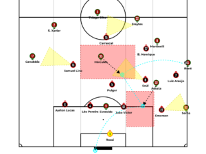 Emerson Royal was marking Kevin Serna, who moved inside and deeper in the corridor where the play started. When Emerson tried to cover, it was too late. This was the same type of gap that Sport exploited in the previous round, taking advantage of the expected insecurity of the young João Vitor, who is still not accustomed to the quick stimuli of professional-level football. Acosta took advantage of that split second and finished first-time, catching Rossi slightly off his line.
