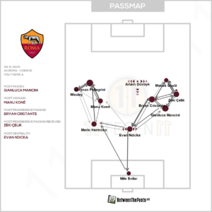 Though there are neat profiles on the left side, Roma has struggled without an imaginative influence on that side of its attack. Dybala has briefly featured in this role, whilst it looked like Lorenzo Pellegrini could make the position his own after scoring the only goal against Lazio. Performances have fizzled since then, and Roma could do with an extra player who could actively disrupt defensive blocks from the inside, or at least the halfspace. With these dynamics at play, Roma’s attack shows promise but has been very inconsistent. When Roma wants to get the ball into the box, it must rely on Dybala (20 passes in total) and Soulé (17 passes, making the Argentines the top two performers in the team by this metric), moving out of the forward line so they can be activated. The box presence is rarely replicated: Roma ranks 16th for successful cutback crosses in Serie A (0.42 per 90). Plenty to work on.