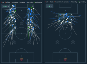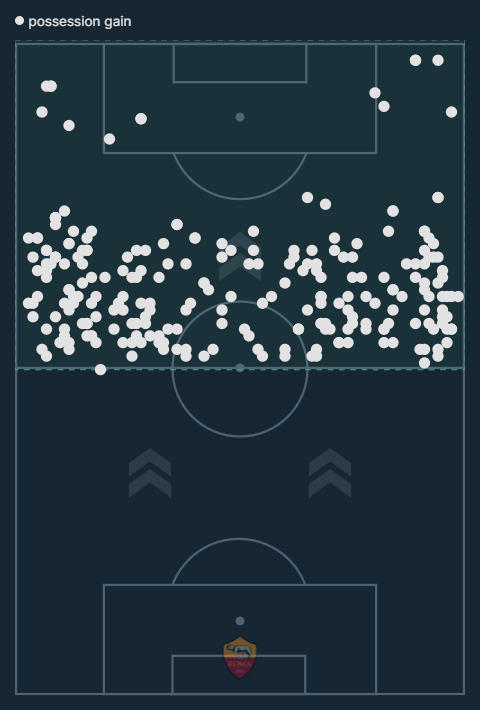 Scatter plot of all Roma’s possession regains in the attacking half. The vast majority around the middle third area.