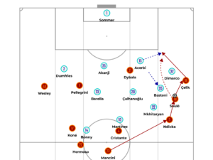 However, the wide stances that Soulé takes up have produced a threat. Against back fives, Soulé’s take-on ability constantly sees him fouled and attracts the left-sided center-back to follow him into wide areas. Through Mancini moving up the lines and Wesley/Çelik also joining the attack, Roma are quite consistent in pulling space open down the outer right channel. Mancini and Çelik (recently, Wesley has played left wing-back to cover for Angeliño) have been able to show some fluid exchanges. Against Udinese, their movements influenced both the penalty that was awarded for Roma, and they produced a one-two inside the box for Çelik to score the second.