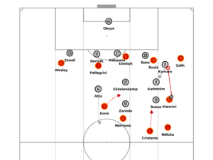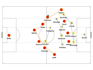 36th minute, versus Udinese (2-0 win): Soulé encouraged Oumar Solet out of the defensive line, which gave room for Çelik to take Hassane Kamara inside the block. As a result, Cristante could chip the ball over the left side of the defense, as Mancini moved around Arthur Atta, and crossed towards Çelik, which struck the hand of Kamara.