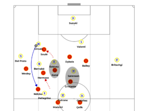 9th minute, versus Parma (2-1 win): Roma’s aggressive man-marking forces the turnover. Soulé encouraged Circati to play a long pass down the channel by pressing outwards, whilst both Wesley and Hermoso were in a position to press on Adrián Bernabé for the short pass. Circati opted to go long, and as the Roma defense had shifted, Ndicka was in a position to win the aerial duel, which led to a pass that ran through to Dybala.