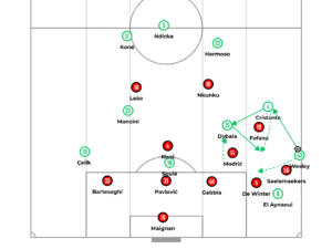 Against AC Milan, Koné was left deep in the rest defense, tasked with stopping Rafael Leão on the transition. However, his management in these situations left Roma compromised, as Leão was still given plenty of room to maneuver, as seen in Strahinja Pavlović’s goal, where Milan broke through. In fact, their overperformance in Expected Goals can be attributed to this game. Out of the 3.81 xG from Milan, 2.7 xG was produced in open play. This would be inflated by some poor giveaways from Roma in possession, which saw Roma being exploited without being punished.