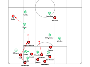 14th minute, versus AC Milan (1-0 loss): El Aynaoui’s run was not connected, but Wesley passed back to Cristante. By drifting inside, Saelemaekers could no longer jump, and the Milan defensive line was too deep as Fofana tried to engage with Cristante. As Fofana was isolated in his jump, the one-two could be made between Dybala and Cristante. In this phase, Cristante would dink the ball through to Wesley, who ran on De Winter’s blind side, but his shot was gathered by Maignan.