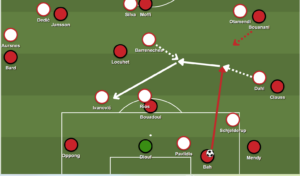 From the opening exchanges, Nice were put into trouble as they tried to play their way out from the back. Benfica pressed aggressively from the front, shifting into a 3-4-3 shape to match Nice’s in-possession shape and to restrict access between the midfield and the defense. This pushed Nice onto the back foot as they looked increasingly to Diouf as their out ball.