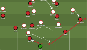 The second half brought no relief to the hosts, and it would take only seven minutes before Benfica found the back of the net. Bard was left to flounder on the left of the defense as Dedić skipped past him and shifted the ball out to Aursnes. Bard tried to recover from his mistake with a sliding tackle, but the winger read his intentions and moved into space.