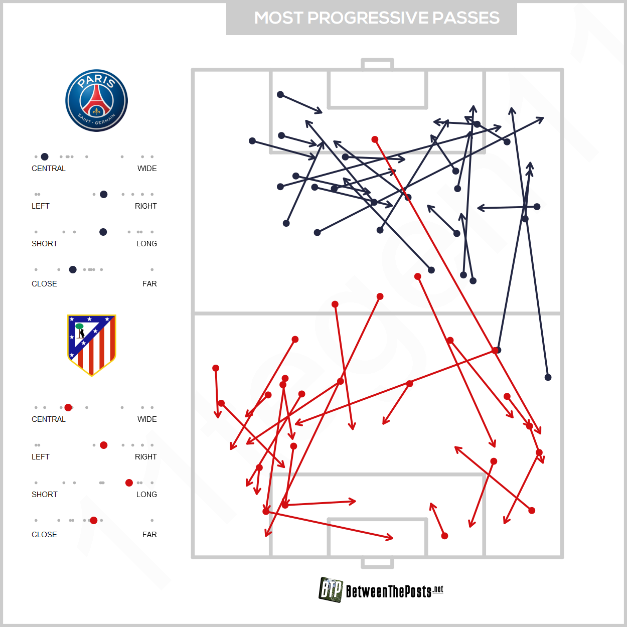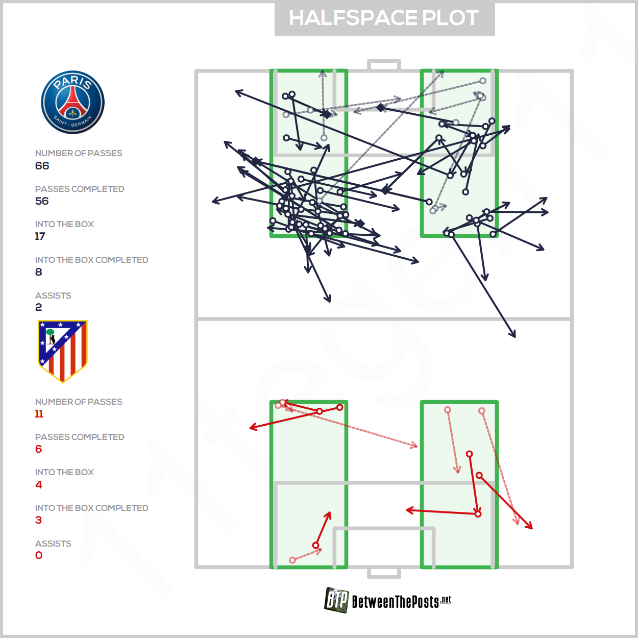 Basically, PSG pinned their wingers alongside the fullbacks when defending in a low block. Or even in a medium block, they didn’t shy away from the effort to drop back. A brutal sacrifice mentality. And it was something that helped avoid the situations Atlético looked for (and usually looks for) through their overlapping fullbacks.
