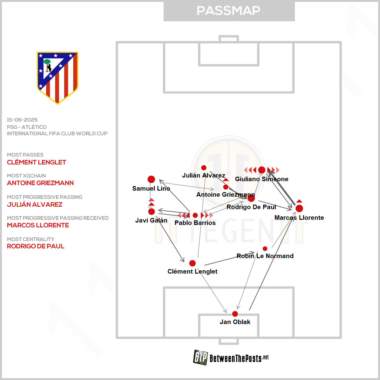 Perhaps their weakest point (which was ultimately confirmed) was their defensive line, far from the best moments of the Simeone Era; from left to right: Javi Galán, Clément Lenglet, Robin Le Normand, and Marcos Llorente. In midfield, academy product Pablo Barrios and Argentina’s World Cup champion Rodrigo De Paul shared the double pivot. On the flanks, Samuel Lino on the left and Giuliano Simeone — the manager’s son and now part of the national team setup — on the right. Up front, Antoine Griezmann sat a few meters behind the star forward, Julián Álvarez.