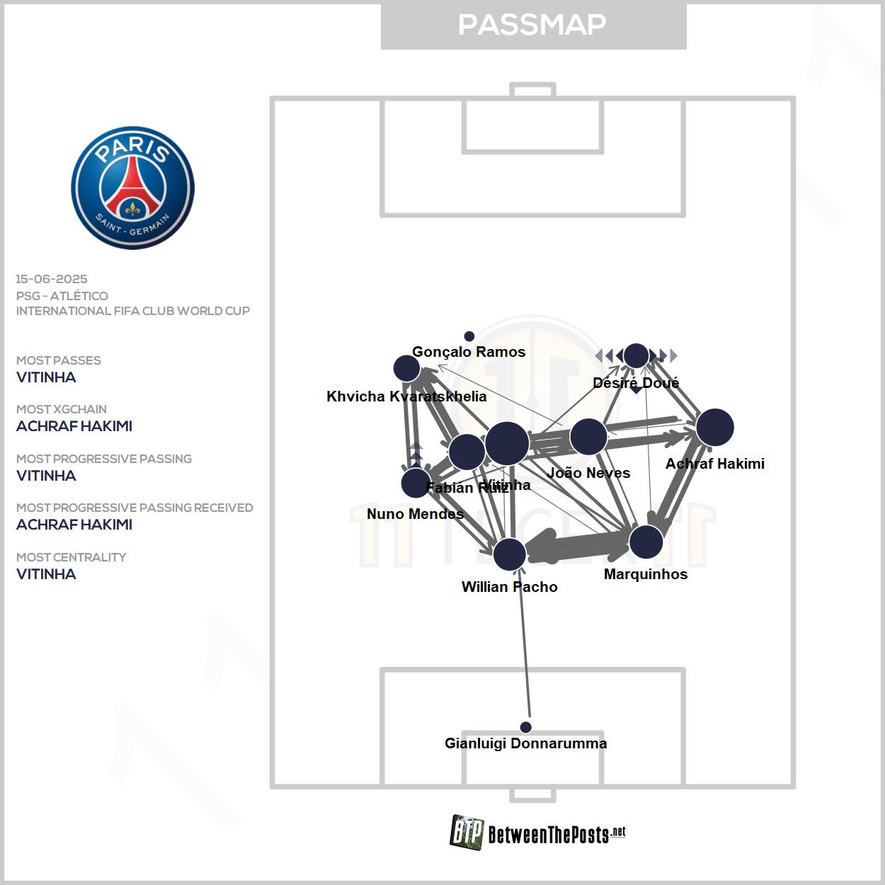 This combined with the profile of striker chosen by Luis Enrique. Unlike Ousmane Dembélé, who played as a false 9 throughout the season and even drifted out wide in many phases of the game, Gonçalo Ramos as a more traditional 9 focused on pinning the defensive line and trying to fix both center-backs, opening up space between the backline and midfield with his presence, rather than dropping into that zone.