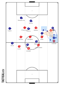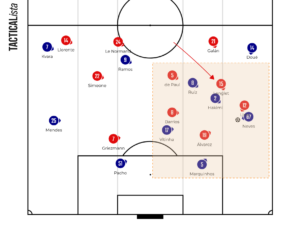 Minute 40′ Searching for Positional Superiorities. During the build-up phase, PSG adopt their classic 3-2-2-3 shape, forming a midfield square. In these situations, Vitinha drops alongside the center-backs whilst Mendes pushes higher, positioning himself inside the square and looking to receive between the lines — exploiting the spaces allowed by the 4-4-2 formation. Meanwhile, Ramos pins both center-backs.