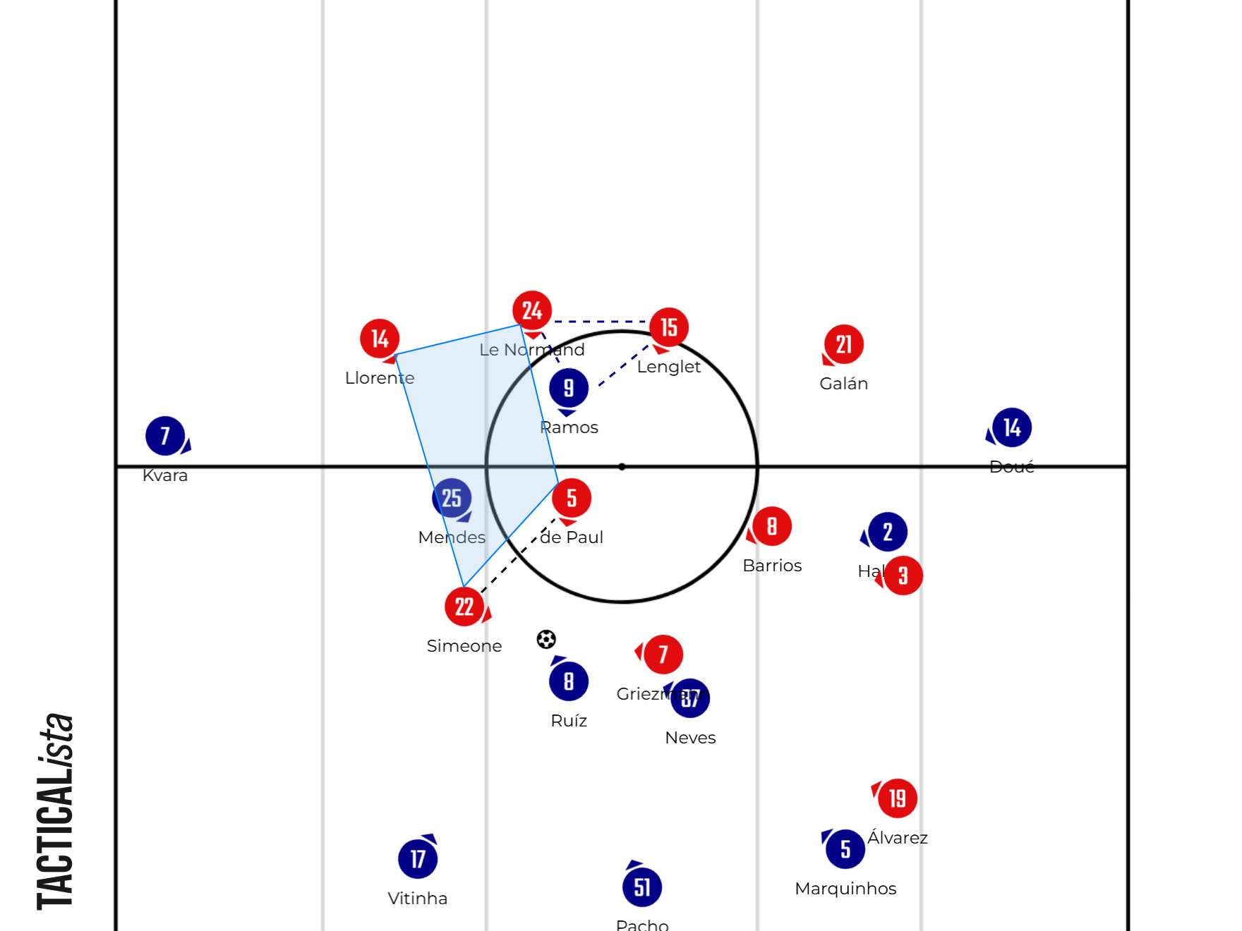 This, against an unusually aggressive block for a 4-4-2 setup, encouraged PSG to exploit these inter-line spaces with a hidden weapon: Vitinha dropping deep and a wide Kvara opened the door for Mendes to position himself in the upper left vertex of midfield.