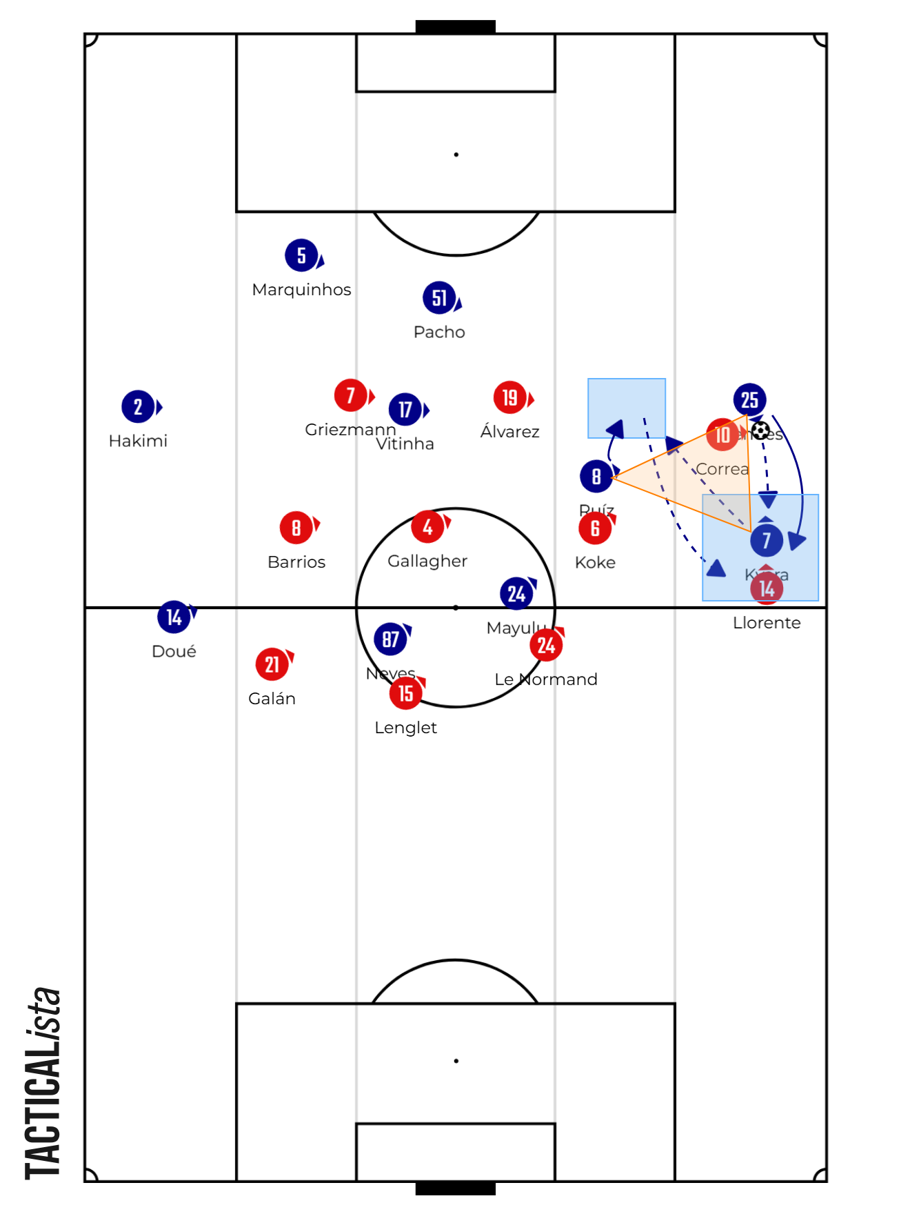 The match began with Atlético de Madrid showing intentions to take the initiative, who in defensive phases and during PSG’s early build-up released their double pivot to press high. Or, when the ball reached the flanks during Luis Enrique’s team’s build-up phase, they created density zones through numerical accumulation (equality or superiority) in tight spaces, trying to induce mistakes or long clearances.