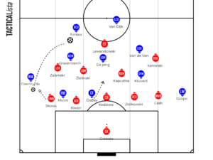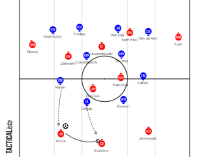 When building out from the back, Poland transitioned into an attacking 3-2-5 shape, with the three centre-backs holding the line, the double pivot of Zielinski and Kapustka dictating tempo, and five players attacking the Dutch backline. The attacking movement was centred around Lewandowski, who served as the pivot and target man—winning 7 of his total 14 contested ground and aerial duels. The attacking midfielders made constant counter-movements in support: Kaminski was tasked with making constant runs in behind to stretch the defence or stand between two defenders to occupy them, while Zalewski was allowed to drop deeper to support the midfield pivot, creating overloads, particularly in the left half-space to link play with Skoras.