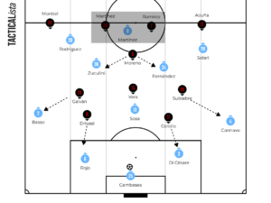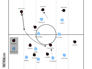 The game started off with River looking to control the game with their setup. Both fullbacks pushed up with the wingers tucking into narrow areas of the pitch. This looked like a 2-2-6 but on many occasions, one of the midfielders, Vera or Moreno, dropped into the first line to form a back three in build up. This meant River often switched from a 2-2-6 to a 3-1-6 in the game depending on the midfielder’s rotations.