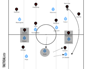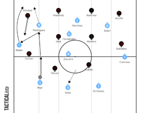 Driussi and Colidio helped the team in some transitional moments, drawing fouls and always looking to be direct. In moments where River often went long, Racing dropped their defensive midfielder, Sosa, into the defensive line to give a numerical advantage when controlling transitions.