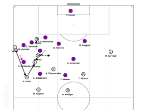 8th minute: Real Madrid’s buildup sequence. Rüdiger entices Álvarez to press and pick out Tchouaméni. The latter works the ball around his compatriot Griezmann. Meanwhile, Le Normand and Ruggeri jump on Güler and Carvajal isolates Valverde against Hancko near the touchlines. The former dribbles past the latter to punish the space behind. Valverde sprints and enters the box to fire the ball into the far post.