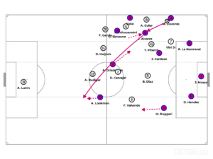 Half an hour gone, Llorente’s advanced position allowed Le Normand to fill his spot, with Cardoso stepping back as a situational center-back. Vinicius cut off the passing lane between the pair; however, Koke came short to bounce the pass off to Le Normand. In the meantime, Alvarez dashed deeper, pulling out Huijsen, and Garcia, being distracted by Llorente’s intention to run, stretched Real Madrid’s lines vertically. Hence, Simeone was able to find a pocket of space to drop and draw Huijsen’s attention. That freed up Alvarez in the middle of the park, with Griezmann roaming around and overloading Brahim Diaz. The pair worked the ball to Lookman in a one-on-one against Carvajal, who blocked off the Nigerian shot.