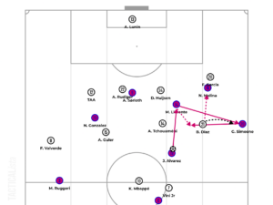 One minute later, Koke pulled wide, dragging Kylian Mbappé with him. That saw Julian Alvarez stepping back behind the block. Meanwhile, Llorente tied Brahim Diaz’s hands down the central channel, whereas Simeone pinned Fran Garcia inside the box. Tchouaméni stepped up onto Alvarez, who found Molina roaming freely down the right half-space. The Argentinian right back pulled the trigger, firing the ball toward the top left corner of the net to equalize the score.
