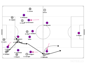 65th minute: Alvarez breaks down Real Madrid’s midfield line to access Llorente down the right half-space. Molina, with an underlapping run, drags Fran Garcia deeper. Llorente shifts wide to generate an overload with Simeone around Brahim Diaz. Llorente collects the pass and drives forward to play the cross. However, Huijsen clears the ball away.
