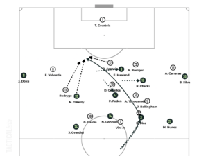 13th minute: Ruben Diaz carries the ball around Vinicius Junior. Doku pins Valverde on the left, Haaland drags Asencio across, and Cherki draws Rudiger’s attention. Tchouaméni and Bellingham cover the right inside channel with Ceballos tracking Foden. O’Reilly looks to attack the space between Valverde and Asencio. However, Rodrygo works his way back, and Asencio retreats to prevent O’Reilly from capitalizing on Diaz’s service.
