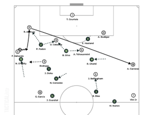 Keeping Nico Gonzalez as an extra player and pressing high up the pitch with a minus one paved the road for Real Madrid to find solutions and progress. With Rodrygo dropping deeper and attracting Foden’s attention Ceballos stepping back and enticing Doku to press, the White team had Asencio as the free man to pick out Valverde. Additionally, the latter took advantage of the large distance O’Reilly had to cover to launch the switch toward Carreras.