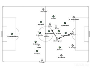 Seconds later, Real Madrid regained the ball, and Tchouaméni switched the play to the left side, where Vinicius Junior and Alvaro Carreras overloaded Matheus Nunes. Real Madrid’s left back collected the second ball and crossed it into Endrick’s head. The nineteen-year-old hit the woodwork.