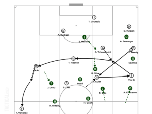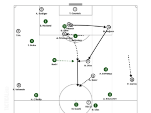 51st minute: After Courtois feeds Pitarch, Tchouaméni darts toward the right to drag Reijnders with him and allow Pitarch to find Huijsen in space. Pitarch’s movements down the right delay Rodri’s lateral shift. Moreover, Fran Garcia advances, drawing Semenyo backward. Thus, Real Madrid generates a three-versus-two situation. Huijsen picks out Brahim Diaz, who bounces the pass off to Tchouaméni, whereas Güler creeps freely across between the lines to develop his team’s progression phase.