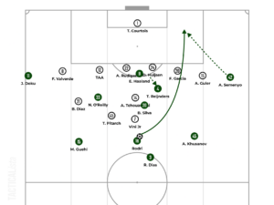 With backward passes, Manchester City tended to bait Real Madrid forward, whilst Haaland and Reijnders pinned the center-backs. So, the Citizens could work the ball out down the expanded space between the lines. In fact, O’Reilly had the license to roam. He pulled out Pitarch in the center, with Arda Güler shifting across to cover the wide channels. O’Reilly sneaked behind Pitarch, whereas Semenyo and Bernardo Silva switched positions. Khusanov broke Real Madrid’s midfield line, accessing O’Reilly down the right half-space. From there, the latter and Semenyo outnumbered Tchouaméni, working the ball to Bernardo Silva. The Portuguese drew Fran Garcia’s attention, whereas Semenyo darted between Tchouaméni and Huijsen to receive Bernardo’s pass toward the byline. Reijnders arrived from behind toward the near post, whilst Haaland attacked the far post. However, Semenyo shot the ball into Courtois’s hands.