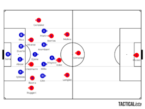 Getafe’s 4-3-3 in possession against Atlético’s 5-4-1.